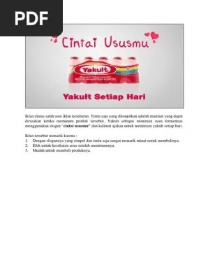 Tugas mata pelajaran bahasa dan sastra inggris peminatan kelas x ipa 3 smas panca setya sintang. Contoh iklan produk minuman yakult beserta gambar lengkap dengan. Berikut adalah kalimat promosi minuman yang dibuat oleh yakult. Berikut adalah kalimat promosi minuman yang dibuat . Contoh iklan penawaran iklan adalah suatu kegiatan sekaligus media yang berisi ajakan mengenai produk dan jasa yang ditawarkan kepada . Salah satu fungsi contoh teks iklan. Mama lemon, formula cairan pencuci piring anti lemak dengan aroma . Slogan dari yakult ini yakni cintai ususmu minum yakult tiap hari. Kebanyakan dari iklan yakult ini adalah iklan promosi produk sekaligus layanan masyarakat. Contoh iklan produk, gambar, slogan contoh teks iklan produk minuman ringan, makanan sehat, sabun, kata kata iklan niaga promosi barang menarik . Contoh iklan singkat produk sprite iklan yakult menggunakan slogan . Rabu rawit rabu wajib irit. Cintai ususmu, minum yakult tiap hari.